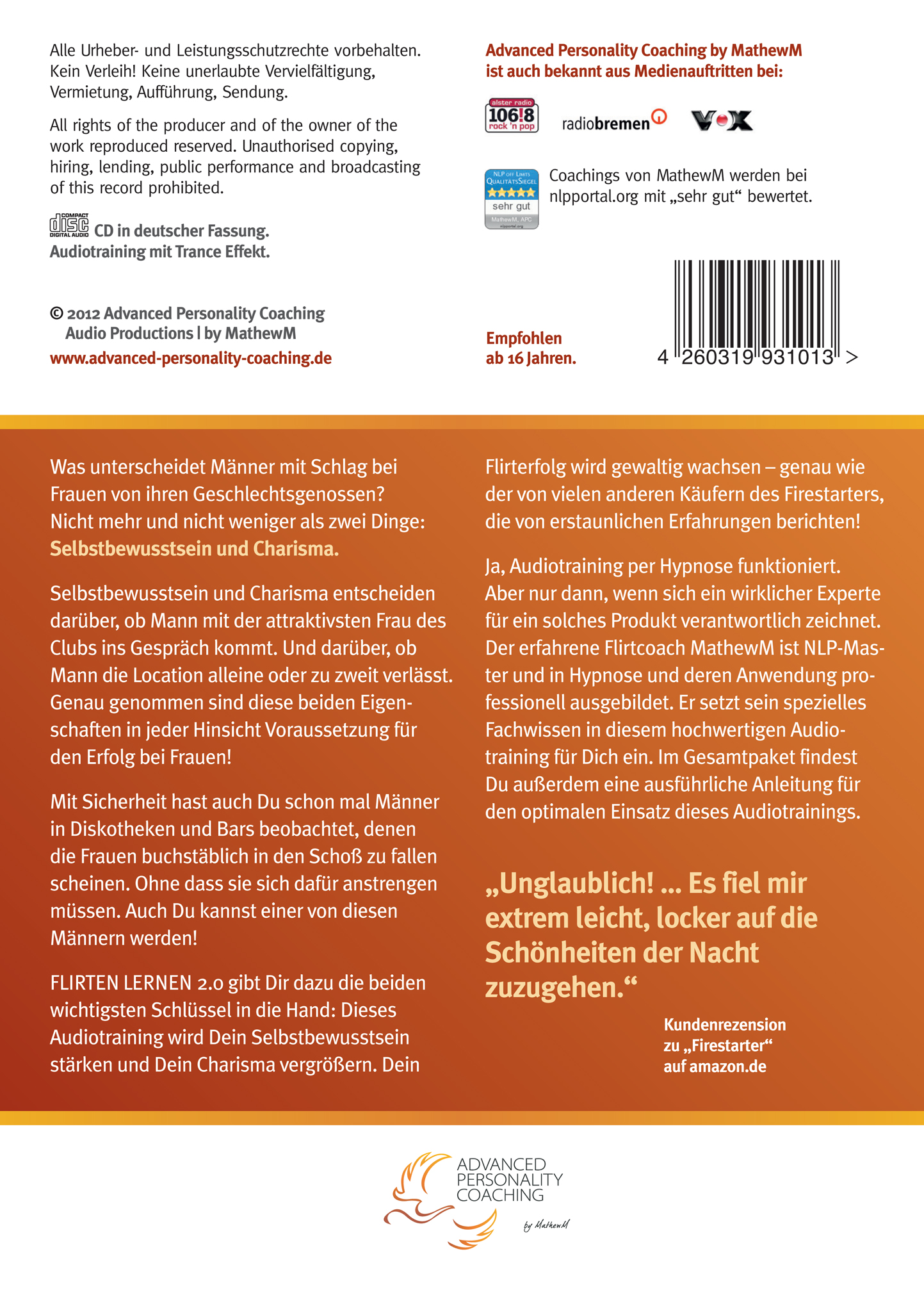 Dann ist "Flirten lernen 2.0" zur Unterstützung genau richtig für Dich! "Flirten lernen 2.0" kann bestimmte unbewusste Körpervorgänge und Signale positiv beeinflussen. Dein Unterbewusstsein wird mit Hilfe von "Flirten lernen 2.0" auf mehr Selbstsicherheit und bessere Ausstrahlung programmiert. Durch "Flirten lernen 2.0" wirst Du auf andere Menschen wesentlich sympathischer und attraktiver wirken. Das andere Geschlecht wird sich deutlich stärker zu Dir hingezogen fühlen.